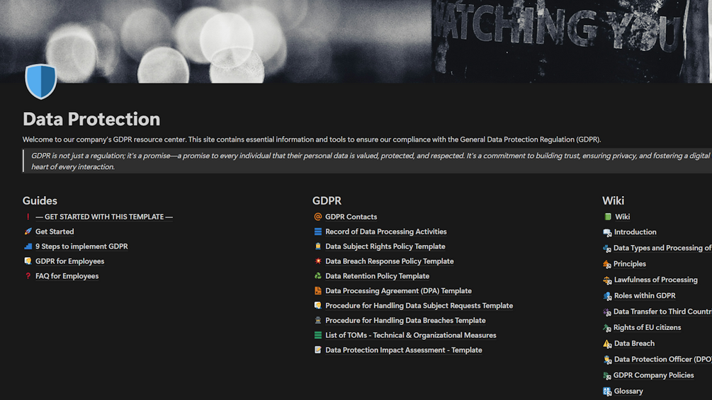 This GDPR template for notion is designed to be the ultimate resource for organizations to get started with data protection regulations. It includes a user-friendly GDPR wiki, a detailed step-by-step implementation guide, and a wealth of customizable templates to cover every aspect of GDPR requirements.